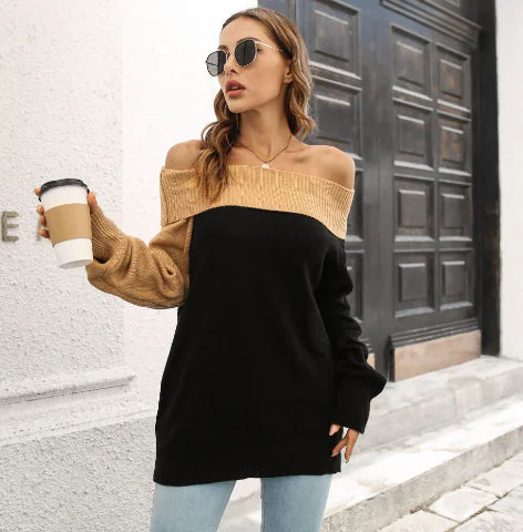 Embrace the essence of effortless style with our stunning Khaki and Black Off-Shoulder Sweater. Designed for the modern woman, this pullover features a captivating color combination that adds a touch of chic to any outfit. The medium thickness ensures comfort and warmth, making it perfect for those cooler autumn days.